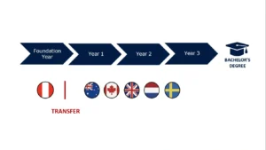 Estudias 1 año desde Perú y luego te trasladas a una universidad en el extranjero para terminar tus estudios en 3 años más.