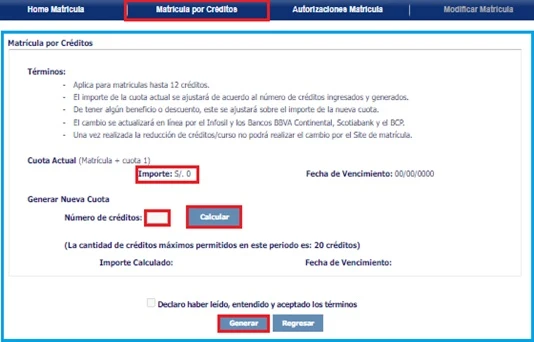 - Si el alumno quisiera adicionar más créditos a los contemplados en esta opción o pagar matrícula completa debe solicitarlo a Créditos & Cobranzas para la revisión de su caso.
