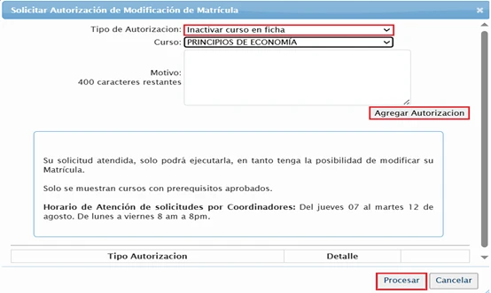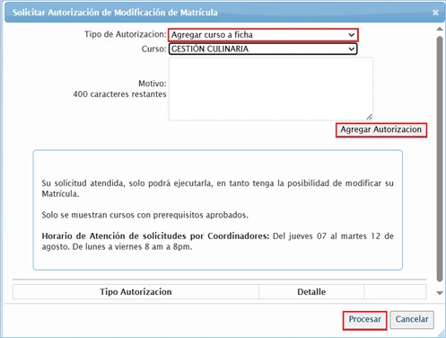 PASO 3: Seleccionar el tipo de autorización: “Agregar curso a ficha”