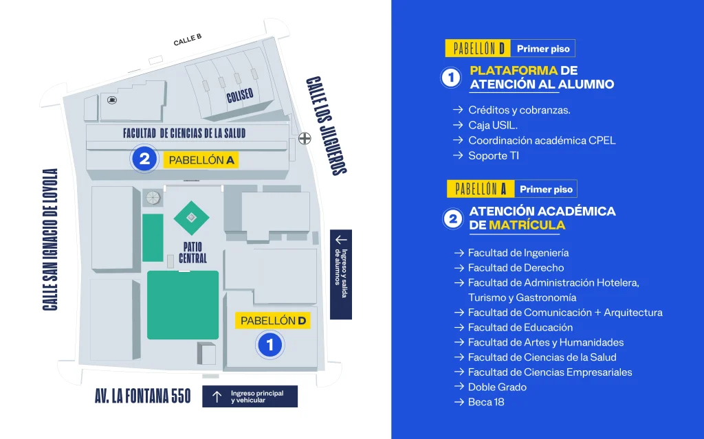- El área de atención académica de matrícula te ayudará con temas relacionados directamente a tu matricula que no hayas podido resolver en el área de atención al alumno. Podrás encontrar el módulo de tu facultad en el Campus 1, pabellón A, 1er piso. Grado americano, Beca 18.