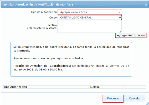 ➡PASO 3: Elige el tipo de autorización: “Agregar curso a ficha”.
