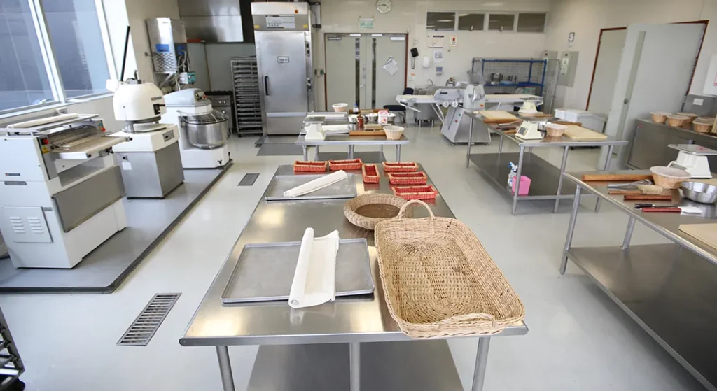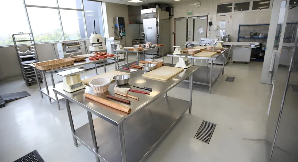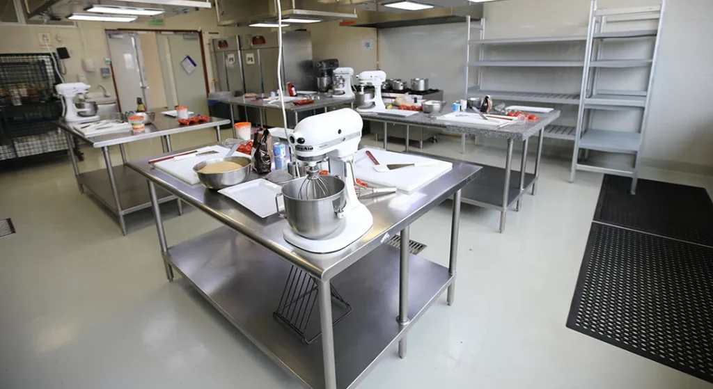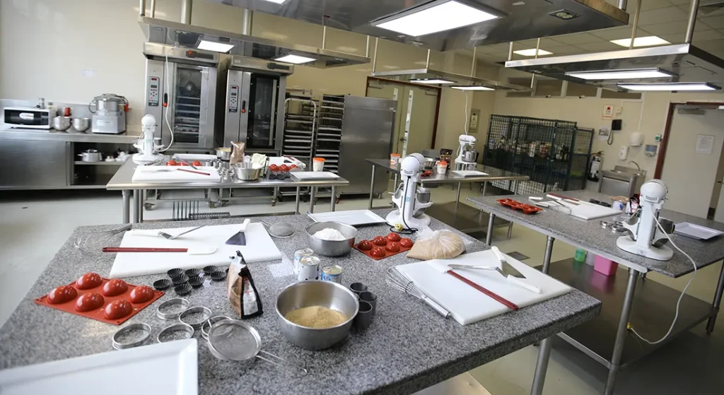 Modernas y bien equipadas cocinas profesionales destinadas a la práctica de técnicas de repostería en grupos reducidos de trabajo.